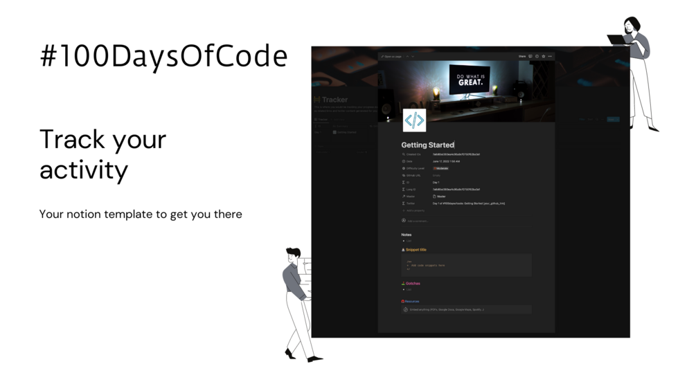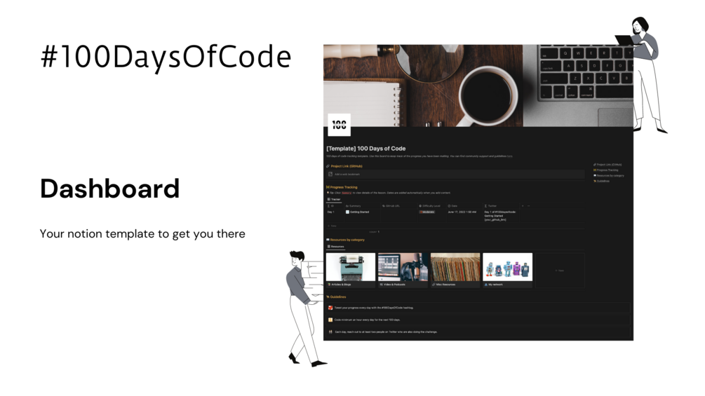 If you made the decision to commit to the #100daysofcode challenge, this template will help you get organized, keep track of your progress, and build resources you can refer to easily. You can also share this with those going on the same journey as you and collaborate.